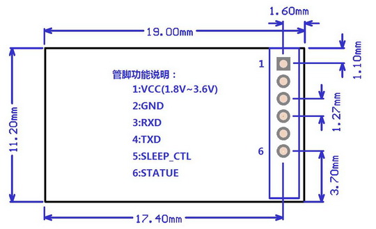 模塊的UART-TXD接口,輸出管腳,與外部控制器的RXD管腳相連接,接口電平為0~0.9*VCC。